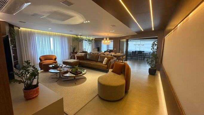 Apartamento decorado por arquiteto, com 191m de área útil, sendo 177m²+14m² de sacada ampliada, distribuído em 03 suítes com sacadas, sala em 02 ambientes integrado terraço gourmet, cozinha com planejados, área de serviço e 03 vagas de automóveis. Apartamento com ambientes bem distribuídos. OBS: Ficarão moveis planejados e soltos, sofá, mesa, 5 a 6 tvs, eletrodomésticos, eletrônicos, etc... Praticamente porteira fechada. Condomínio exclusivo com estrutura completa: portaria 24h, piscinas (borda infinita, raia de 25m e infantil), quadras de tênis, basquete e society, espaço pet, academia reformada, sauna, spa, sala de yoga e pilates. Conta também com 3 salões de festa (adulto, juvenil e infantil), cinemas para adultos e crianças, brinquedoteca, ateliê, coworking, pista de caminhada entre outros.